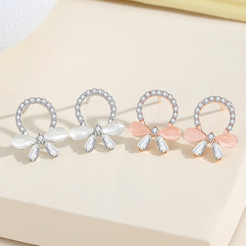 S925 핑크 지르콘 리본 매듭 스터드 귀걸이 여자 창조적 인 디자인 달콤한 절묘한 우아한 귀걸이